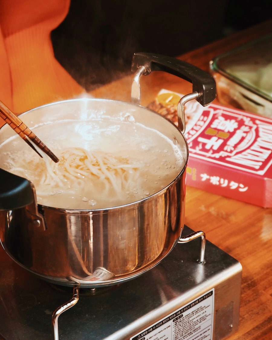 ②麺をゆでる:たっぷりのお湯を沸かして、麺を7〜8分を目安に茹でます。菜箸で麺をほぐしながら茹でるのがポイント。