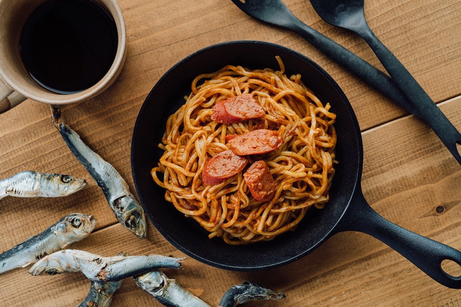 煮干しとナポリタン。一見ありえない組み合わせが、食べた瞬間に「これしかない」に変わります。